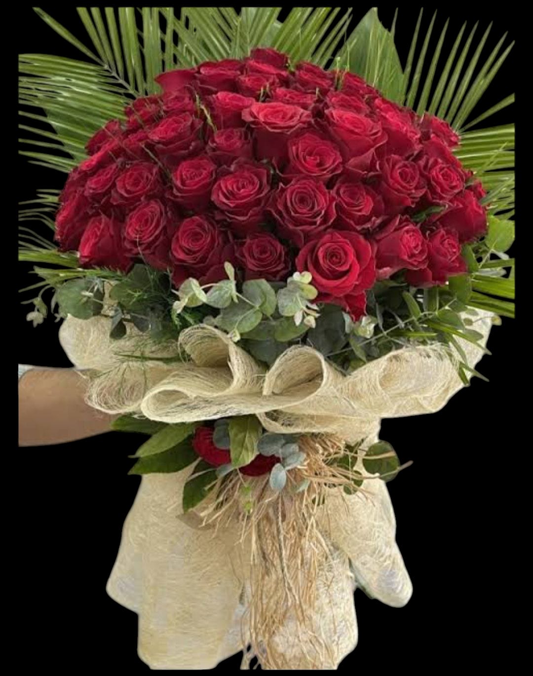 Kız isteme törenlerinin vazgeçilmezi olan 41 adet kırmızı gül, yeşil yapraklar ve okaliptüs eşliğinde büyük ve etkileyici bir buket haline getirildi. Doğal rafya detaylı ambalajı ve palmiye yaprakları ile zenginleştirilen bu aranjman, hem geleneksel hem de modern tarzı bir arada sunar.