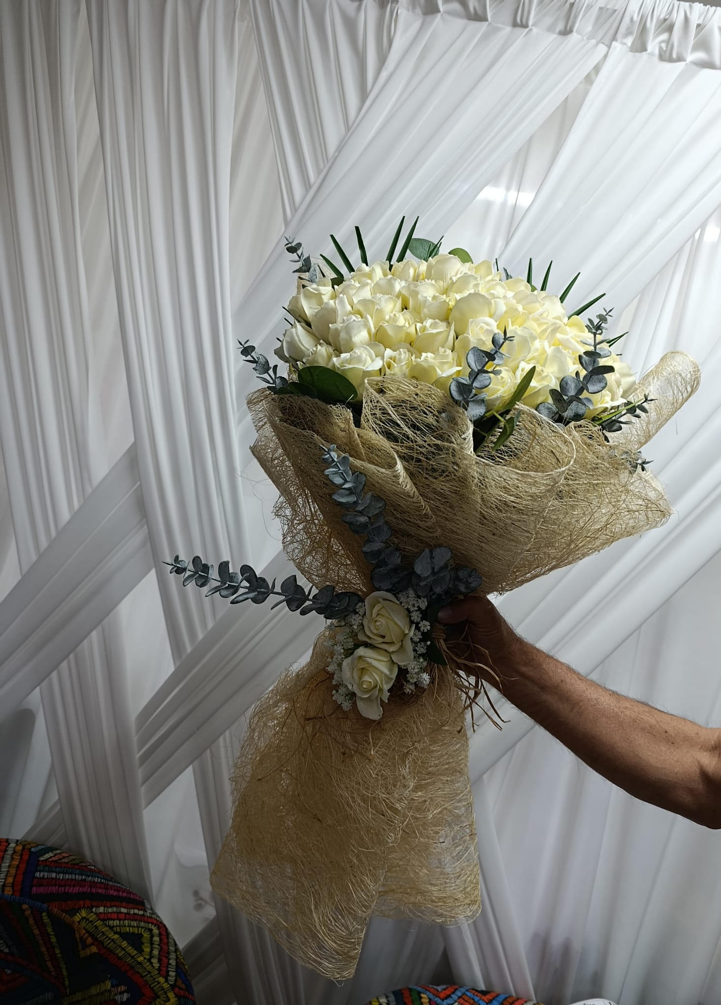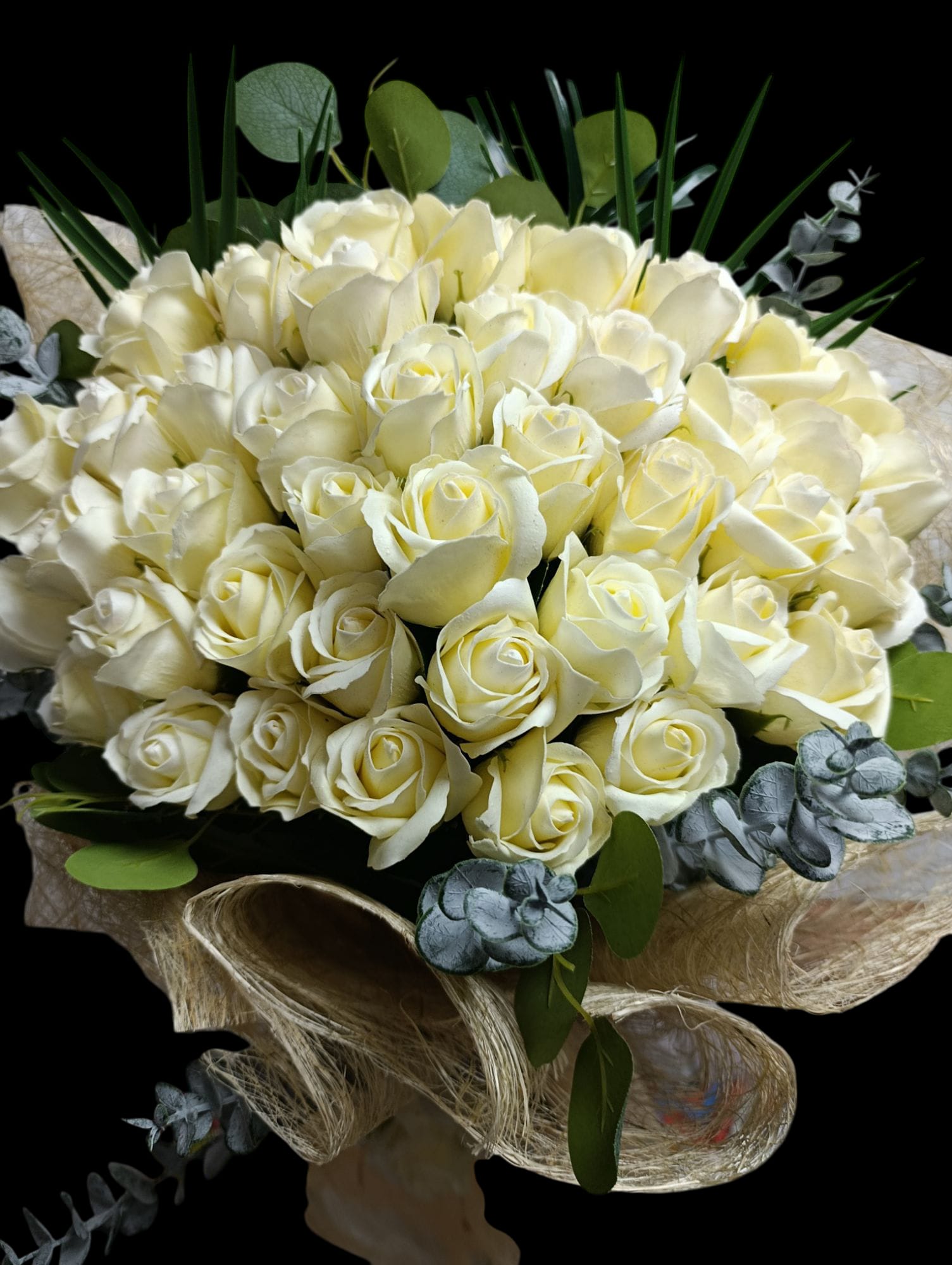 Zarafetin ve saflığın simgesi beyaz güller, 41 adet yapay çiçek ile özenle hazırlanmış bu gösterişli bukette buluşuyor. Eucalyptus ve yeşillik detaylarıyla doğal bir görünüm kazanan bu buket; söz, nişan, yıldönümü ve özel günler için kalıcı bir hatıra sunar.
