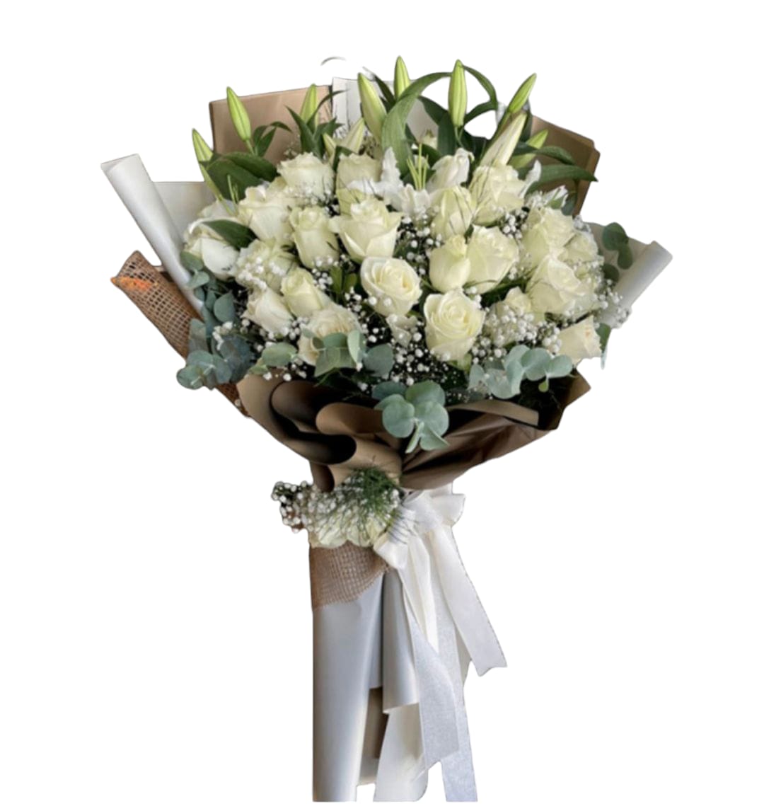 Muda Çiçekçilik’in ustalıkla hazırladığı bu şık buket; taptaze beyaz güller, zarif lilyumlar, cipso detayları ve doğal yeşilliklerle hayat buluyor. Özel kraft ambalaj ve saten kurdele ile tamamlanan bu aranjman, saf duyguları ve zarafeti yansıtan unutulmaz bir hediye seçeneğidir.