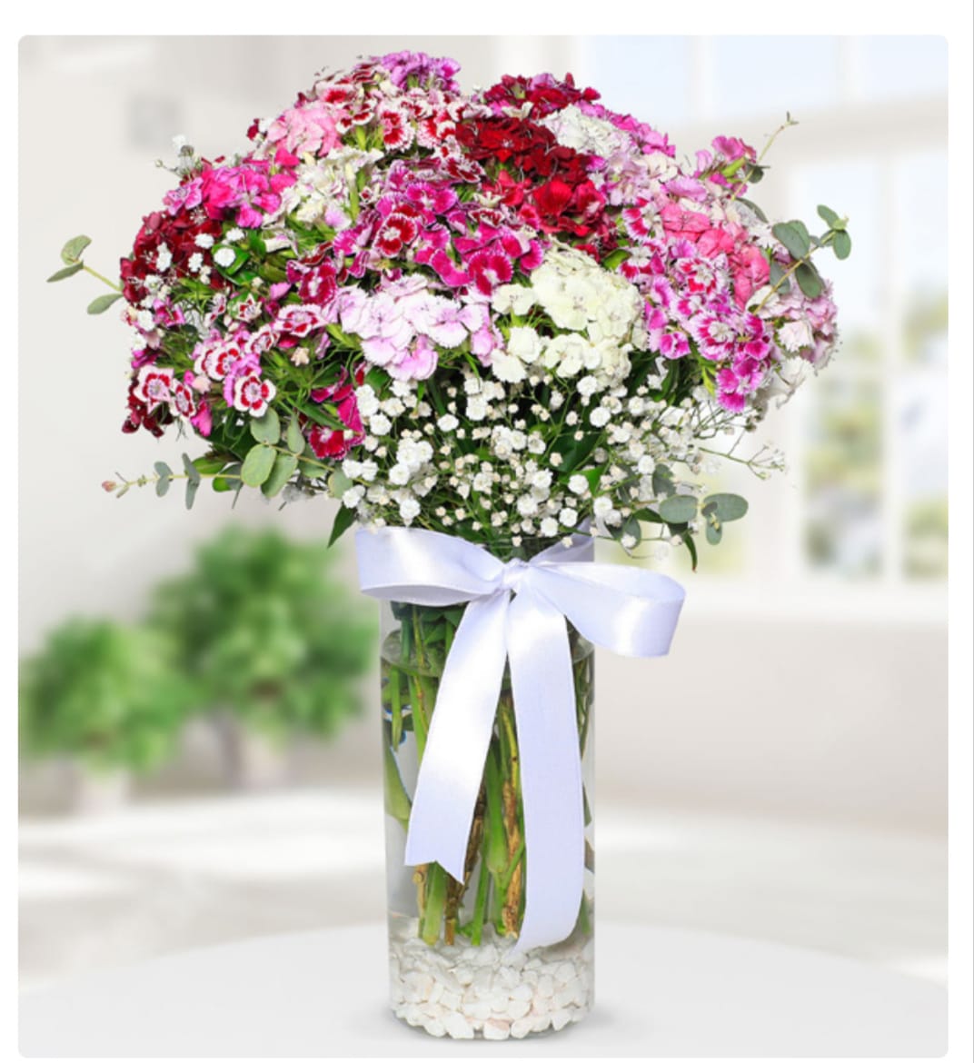 Pembe, kırmızı ve beyaz tonlarında Hüsnüyusuf çiçekleri ile hazırlanan bu zarif aranjman, cam vazo içerisinde şık taş dekorlarıyla sunulmaktadır. Beyaz kurdele detayıyla tamamlanan bu çiçek tasarımı; ev, ofis ve tüm özel günler için hem sade hem de göz alıcı bir seçenektir.